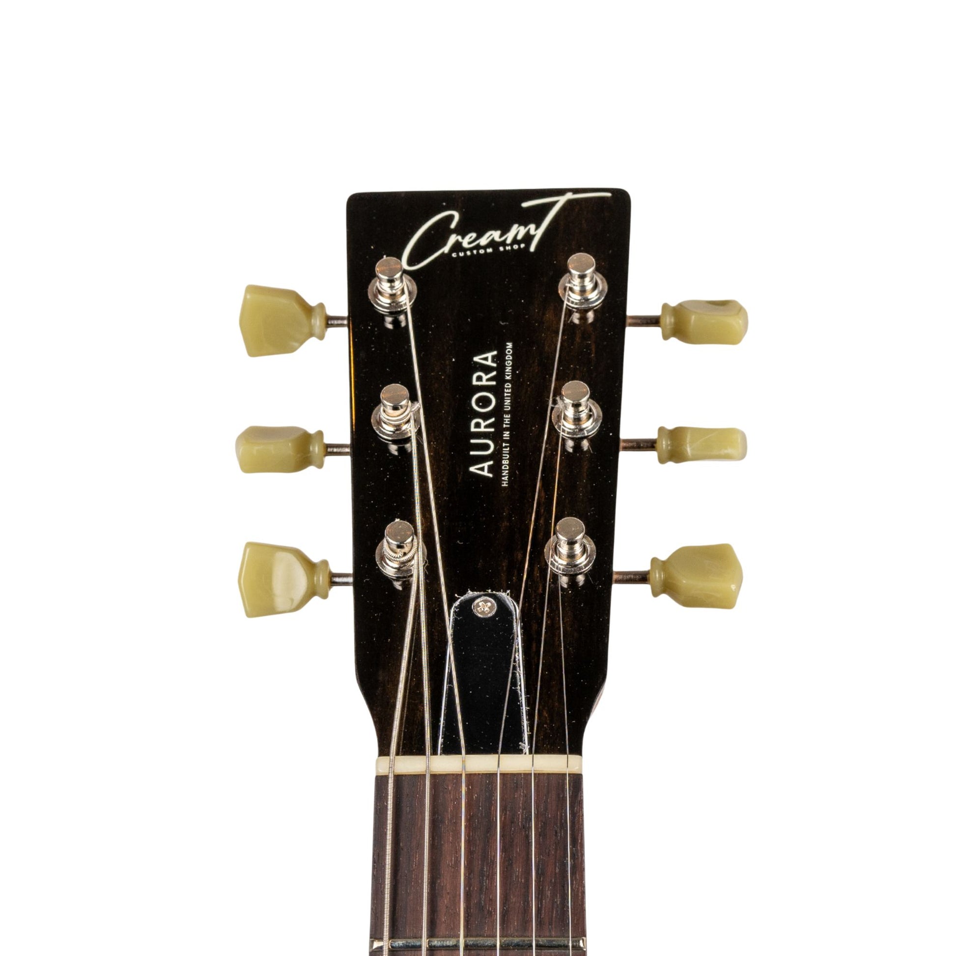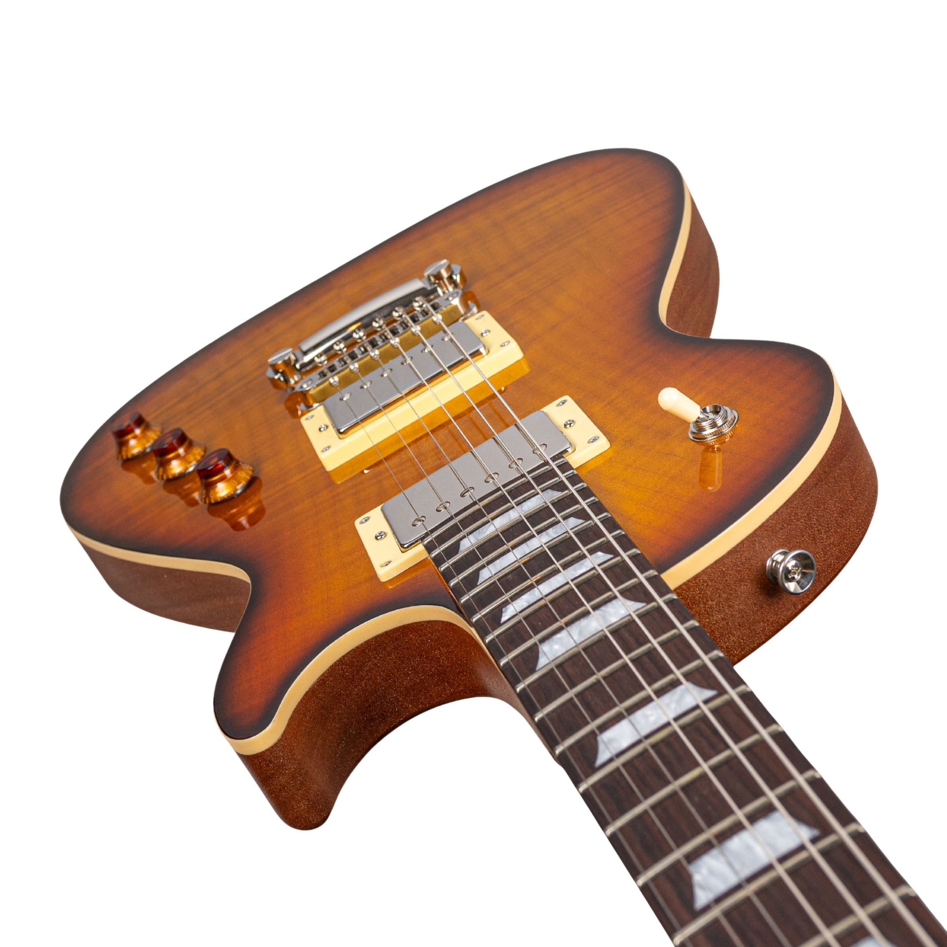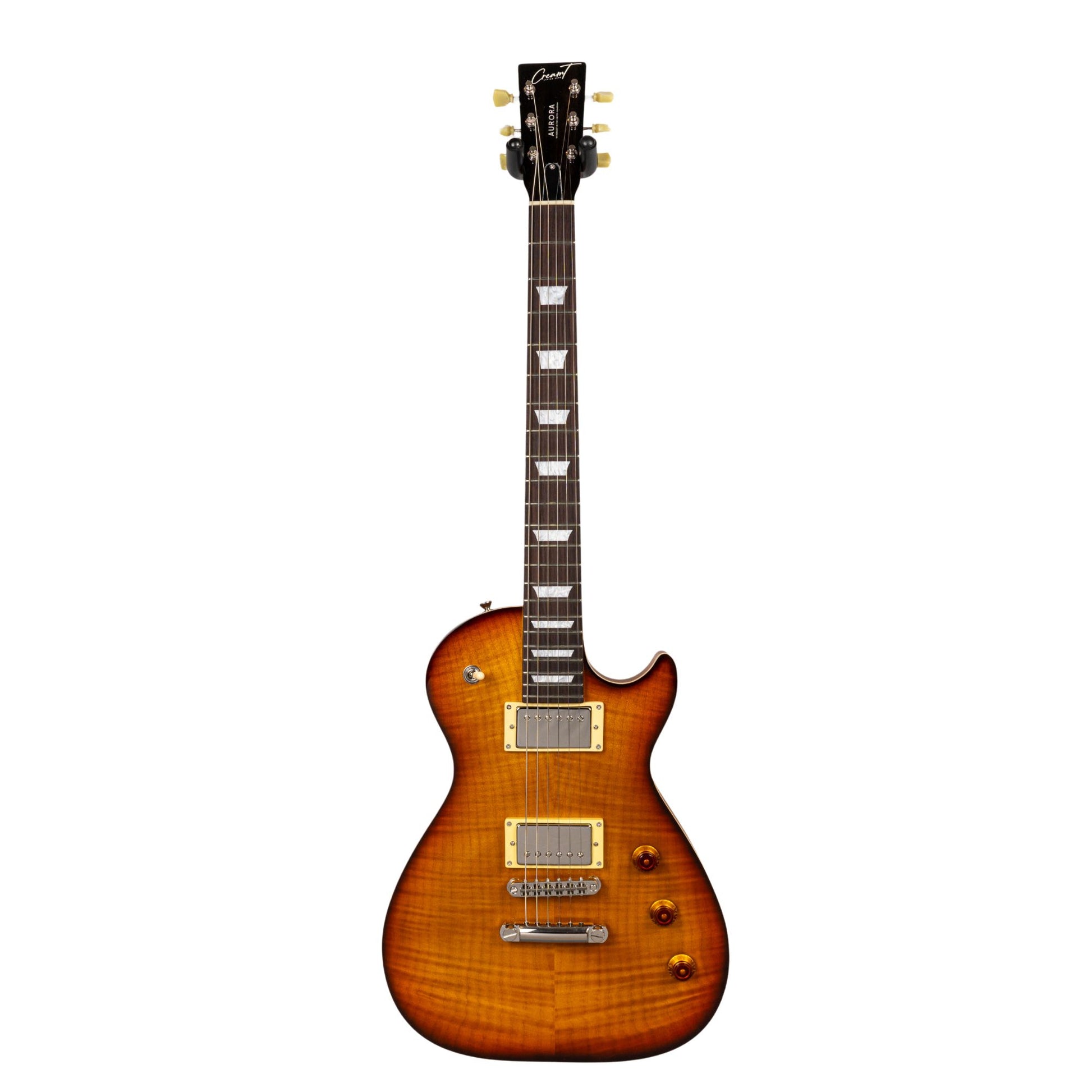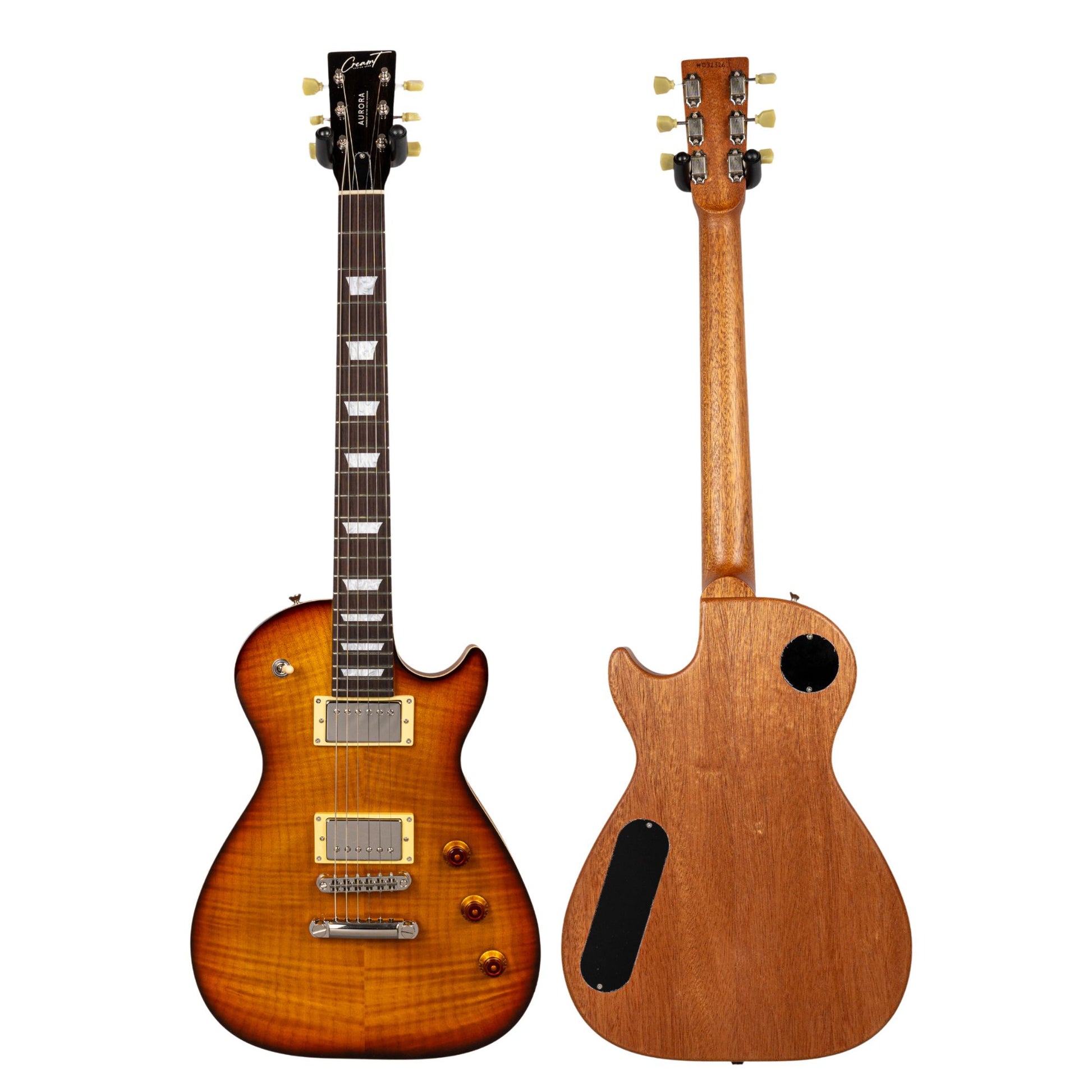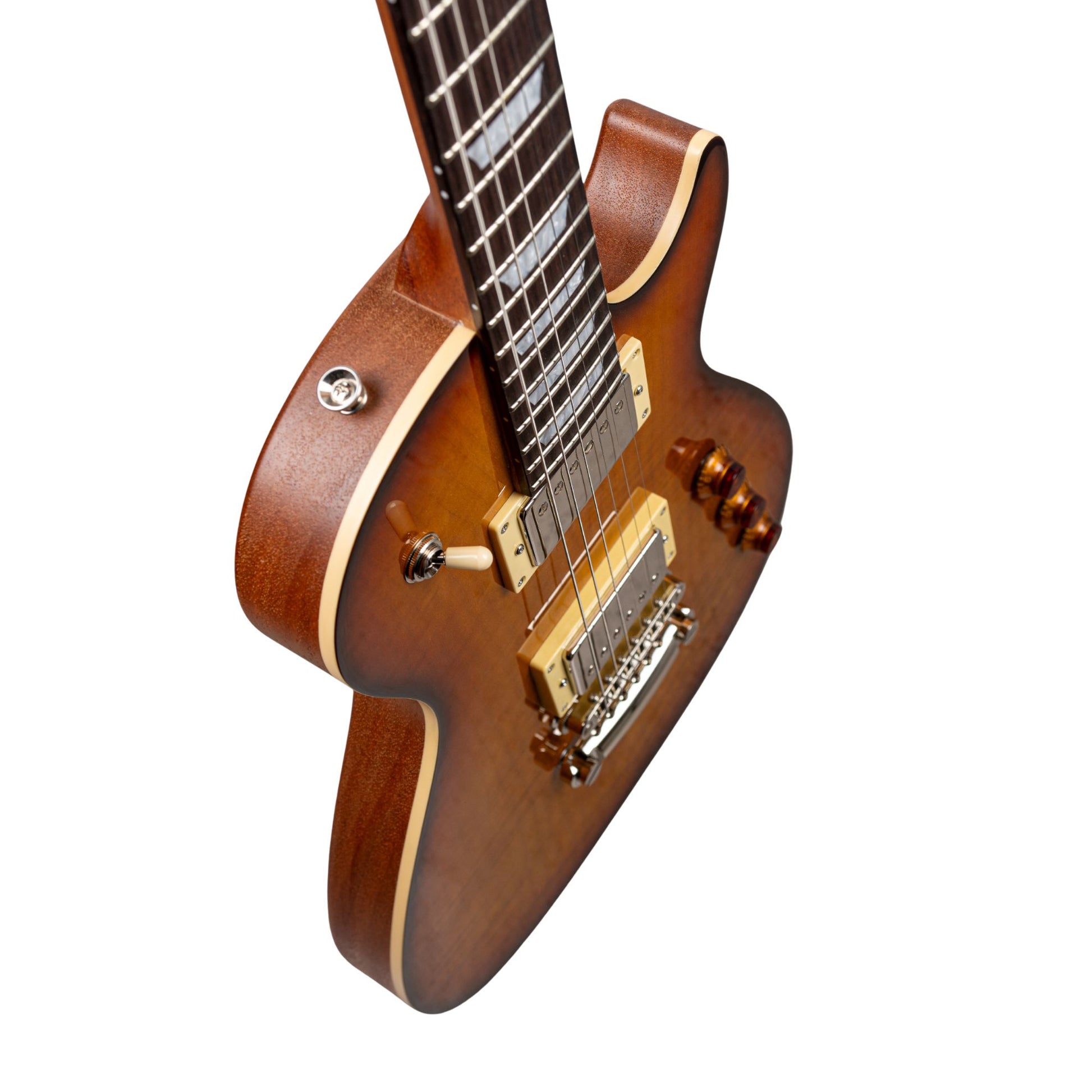 This is our custom version of the original Aurora designed by Billy F Gibbons. We added some more traditional features including a 3 way toggle switch, tune-o-matic bridge and stoptail. It comes with our Cream of the Crop humbuckers as standard.
