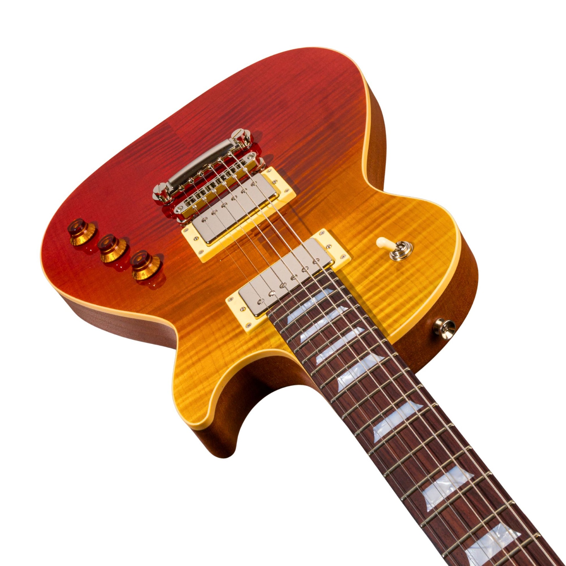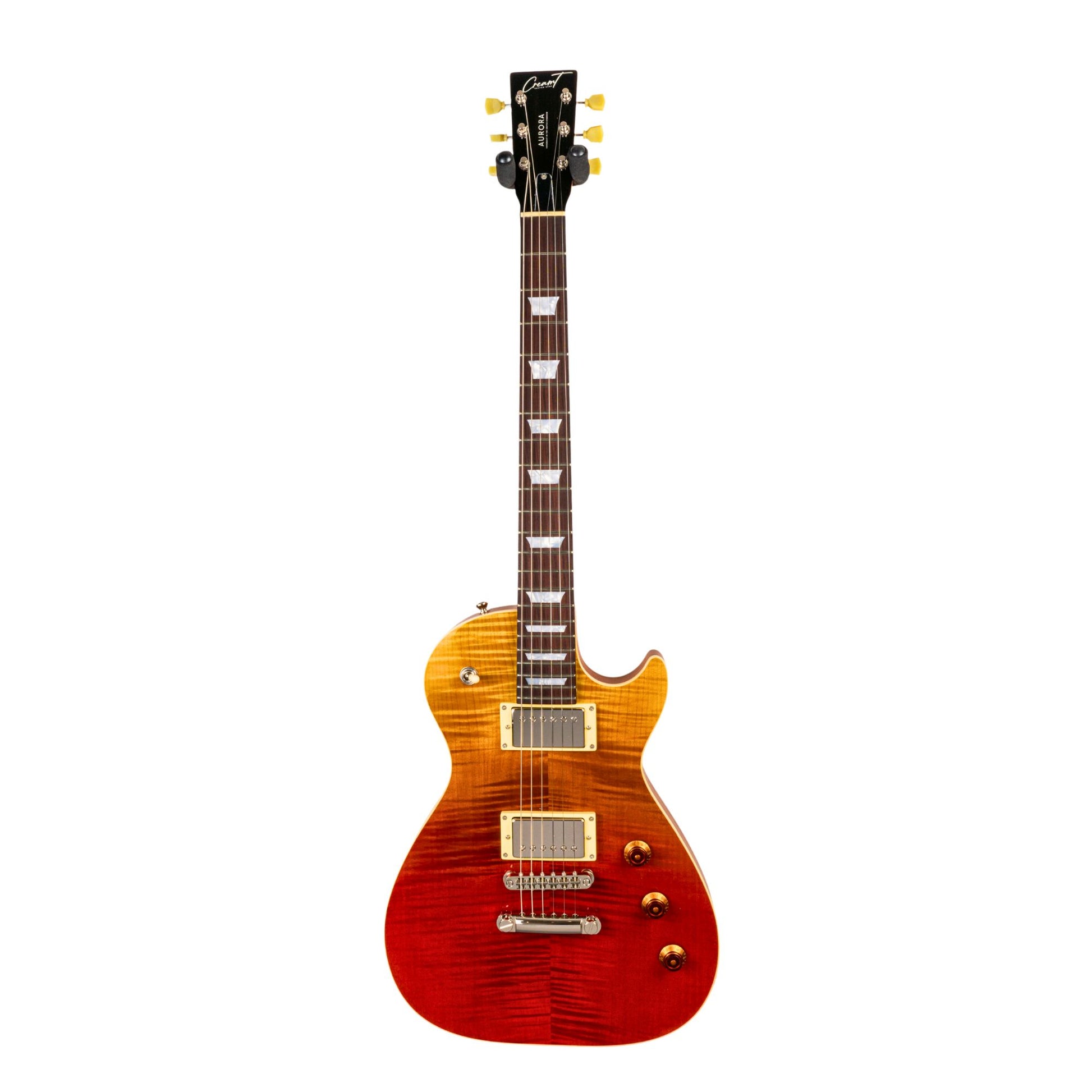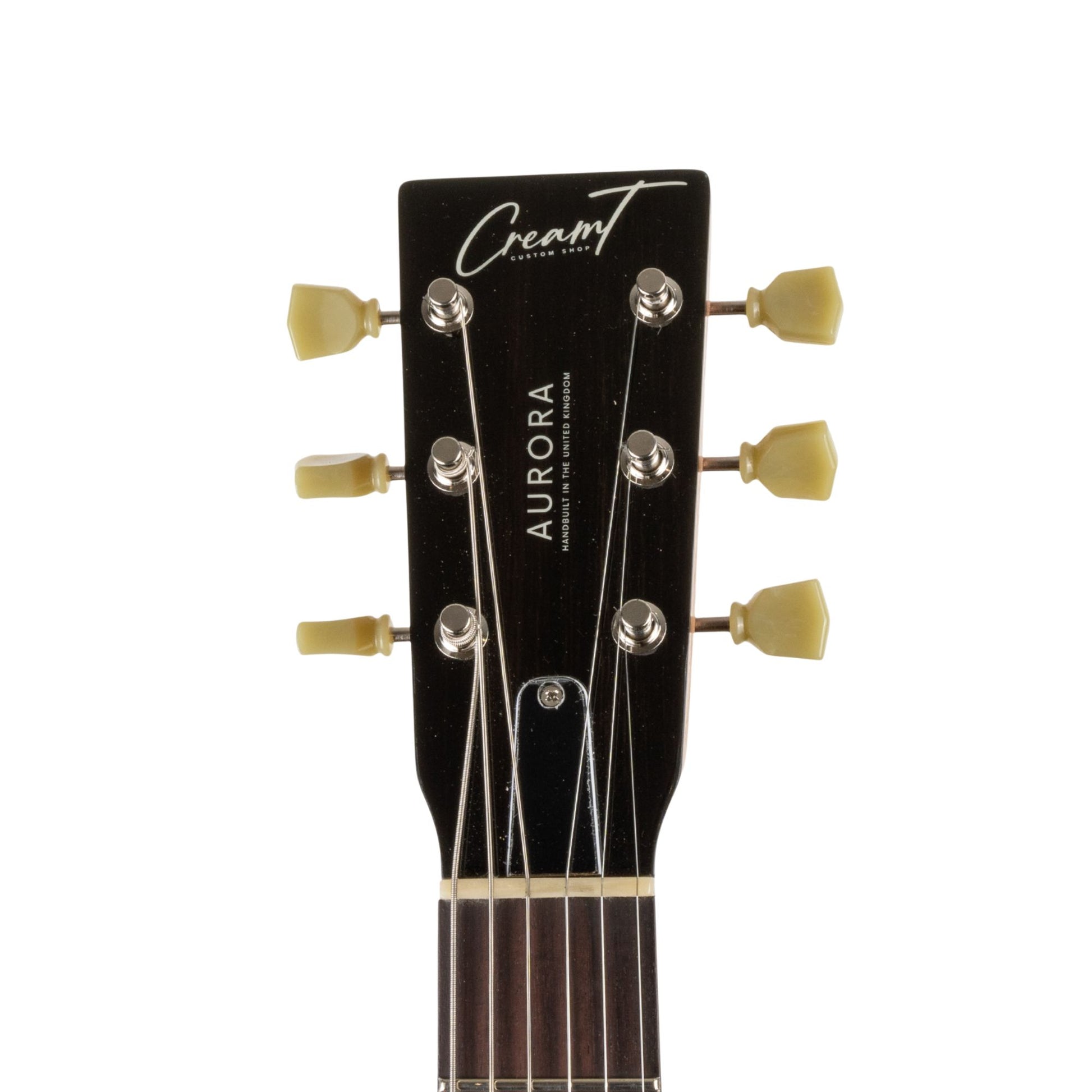 This is our custom version of the original Aurora designed by Billy F Gibbons. We added some more traditional features including a 3 way toggle switch, tune-o-matic bridge and stoptail. It comes with our Cream of the Crop humbuckers as standard.