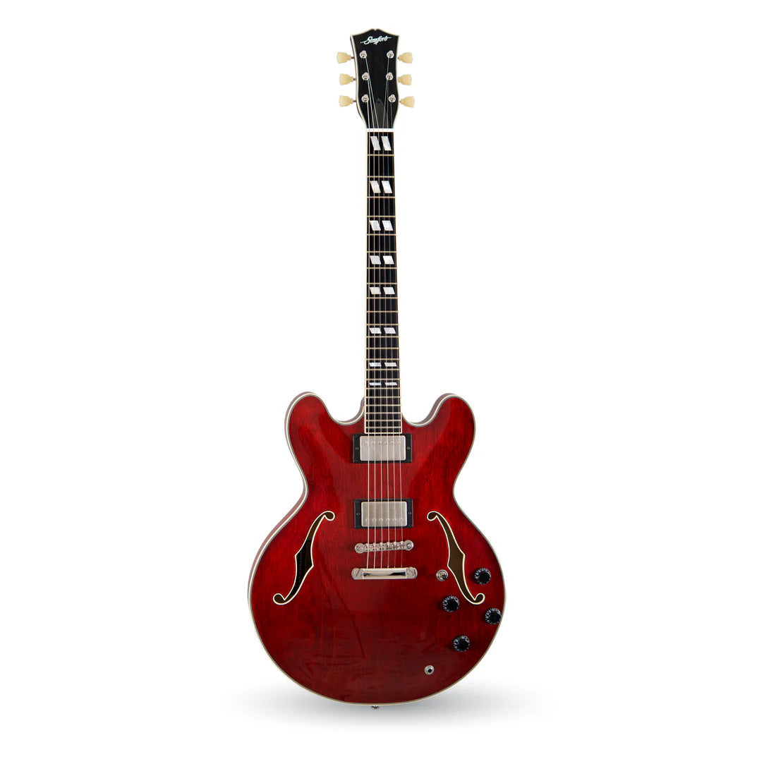 The body shape of the Stanford Crossroad Thinline 35 is one of the classic electric guitars. Numerous guitarists from pop and rock history played on this legendary thinline double cutaway. The Stanford Crossroad Thinline 35, equipped with a sustain block and two PAF pickups, delivers the classic sounds that you expect from an electric guitar of this type in all facets.